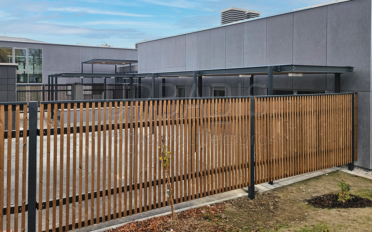 A juego con la pérgola, se proyectó un vallado especial que sigue con la misma línea estética. Esta combinación crea un espacio en sintonía y singularidad. Trabajamos proyectos a medida para cubrir las necesidades de casa oportunidad.