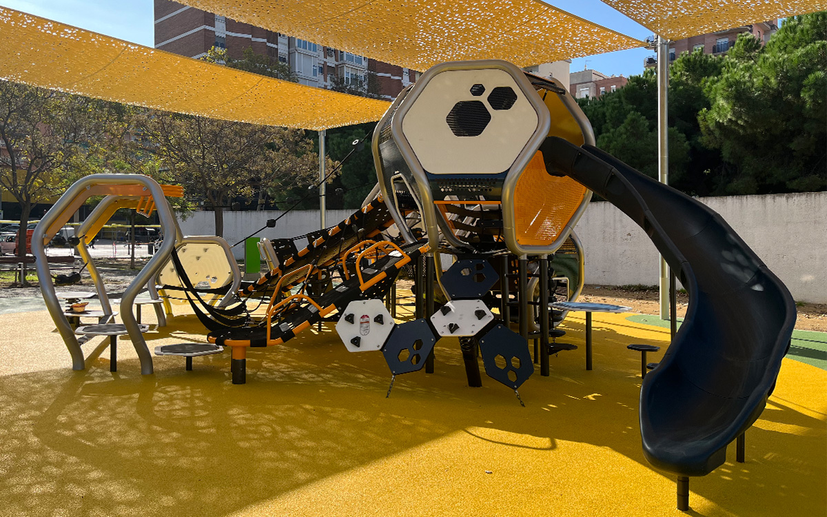 El parque gira en torno a Hedra de la firma Landscape Structures, una estructura multijuego con una configuración geométrica única, donde los circuitos crean modos de juego a varios niveles en constante evolución. Los niños pueden disfrutar y explorar diversas metodologías de juego en cada una de sus estancias. Hedra ofrece un mundo de posibilidades, donde los niños pueden desarrollar su intuición y curiosidad, donde las experiencias se crean paso tras paso. Hedra es sinónimo de juego libre y adaptado para todos los niños que siempre encontrarán la manera de jugar en la que se sientan seguros y puedan explorar libremente sus límites.
