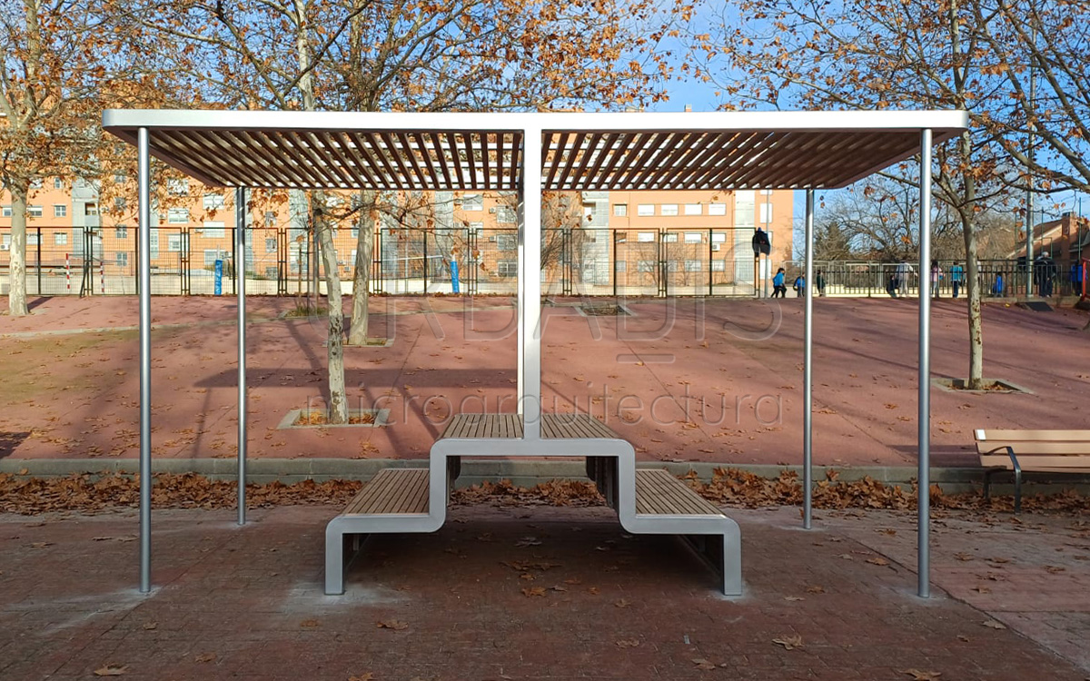 Nuestra pérgola Habana es un sistema modular que permite grandes áreas de sombra creando espacios diáfanos bajo ella, grandes umbráculos con pilares elegantes al tresbolillo. La pérgola Perhexa dota de carácter y diversión el espacio, la versatilidad de umbráculos y colores permite crear infinitas combinaciones que se adapten a la estética buscada. Y por último, nuestros oasis son espacios que dan libertad al usuario, sus gradas permiten diversas formas de expresión y fomentan la interacción entre los alumnos.