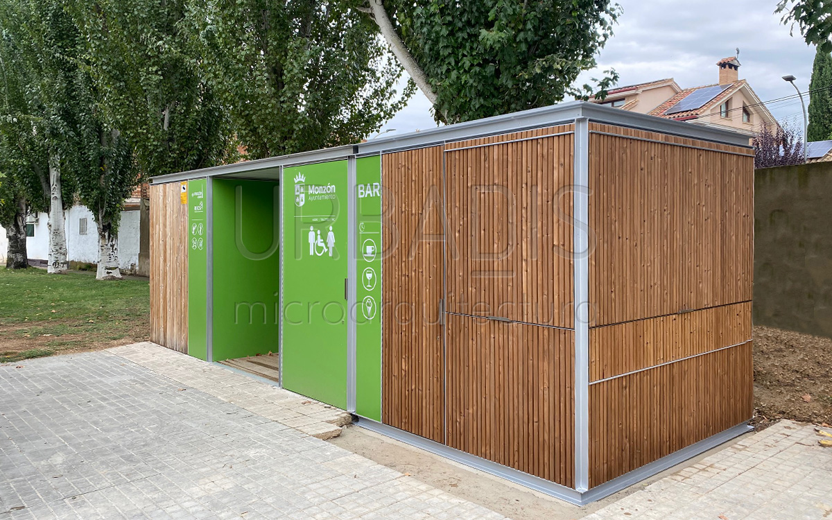 Hemos ampliado un quiosco Habana en el Parque Jesús Laborda de Monzón. A finales de 2023 instalamos un quiosco de aseos modelo Habana, compuesto por un lavabo individual, otro adaptado y un espacio de almacenamiento. Dos años después realizamos la ampliación del mismo con un quiosco bar del mismo modelo Habana.