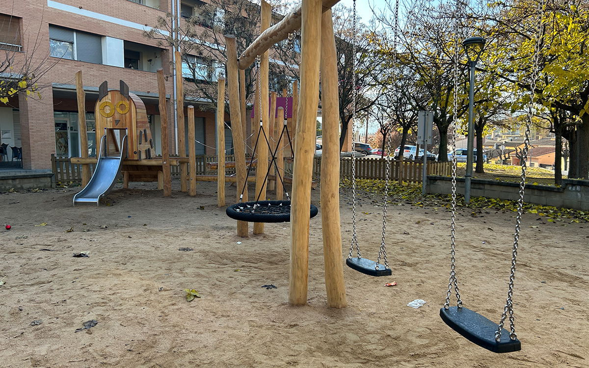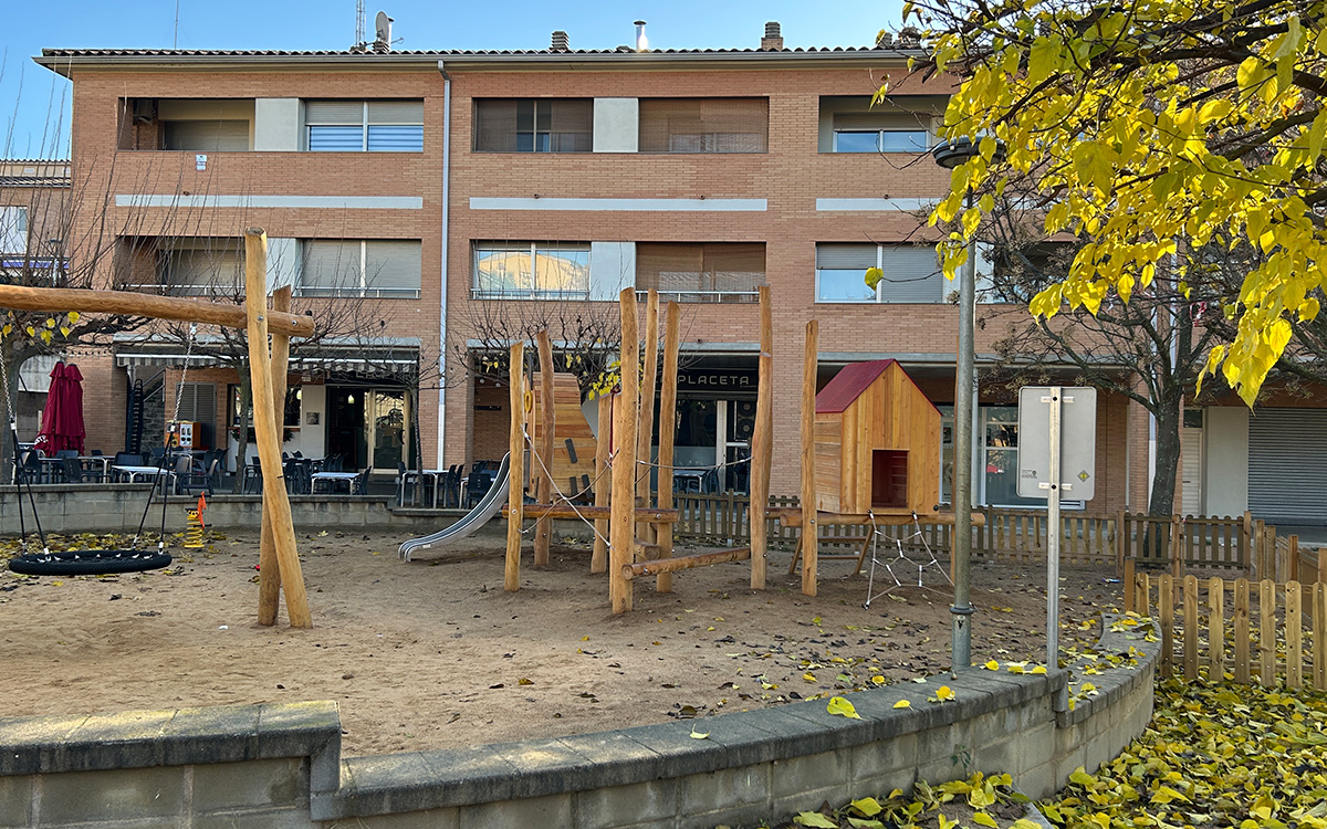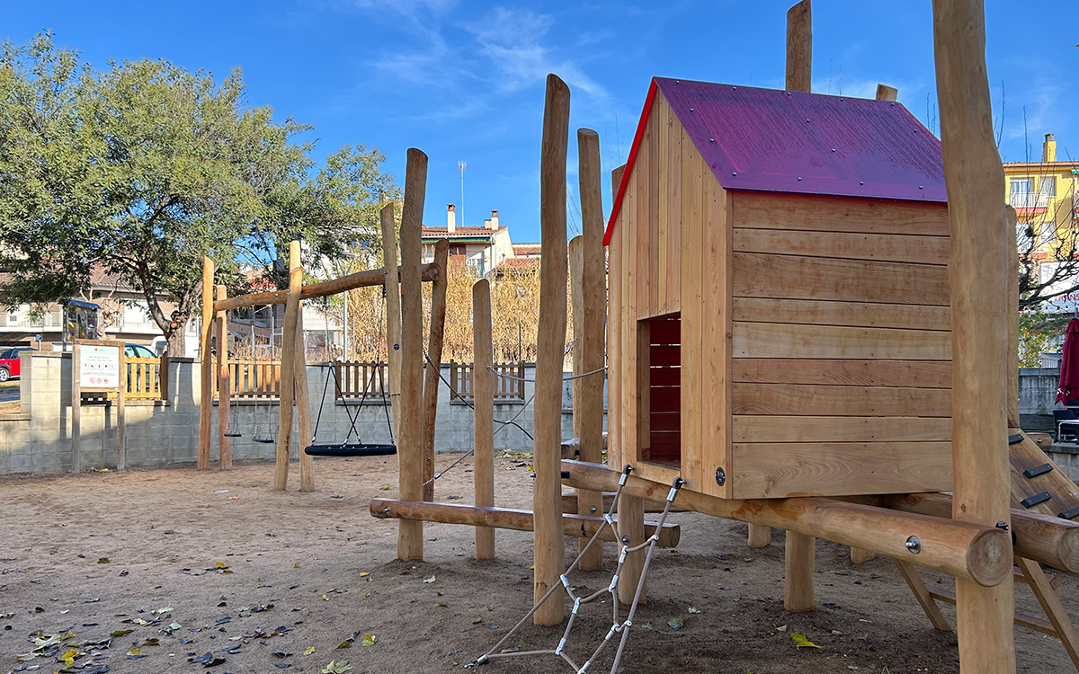 Hemos renovado por completo el área de juegos de la Pl. Poeta Ruyra de Hostalrich, apostando por un nuevo modelo de parque de madera de robinia que se mimetiza con el entorno y naturaliza el espacio. Un refugio para familias y un espacio de ocio y diversión para los más pequeños.
